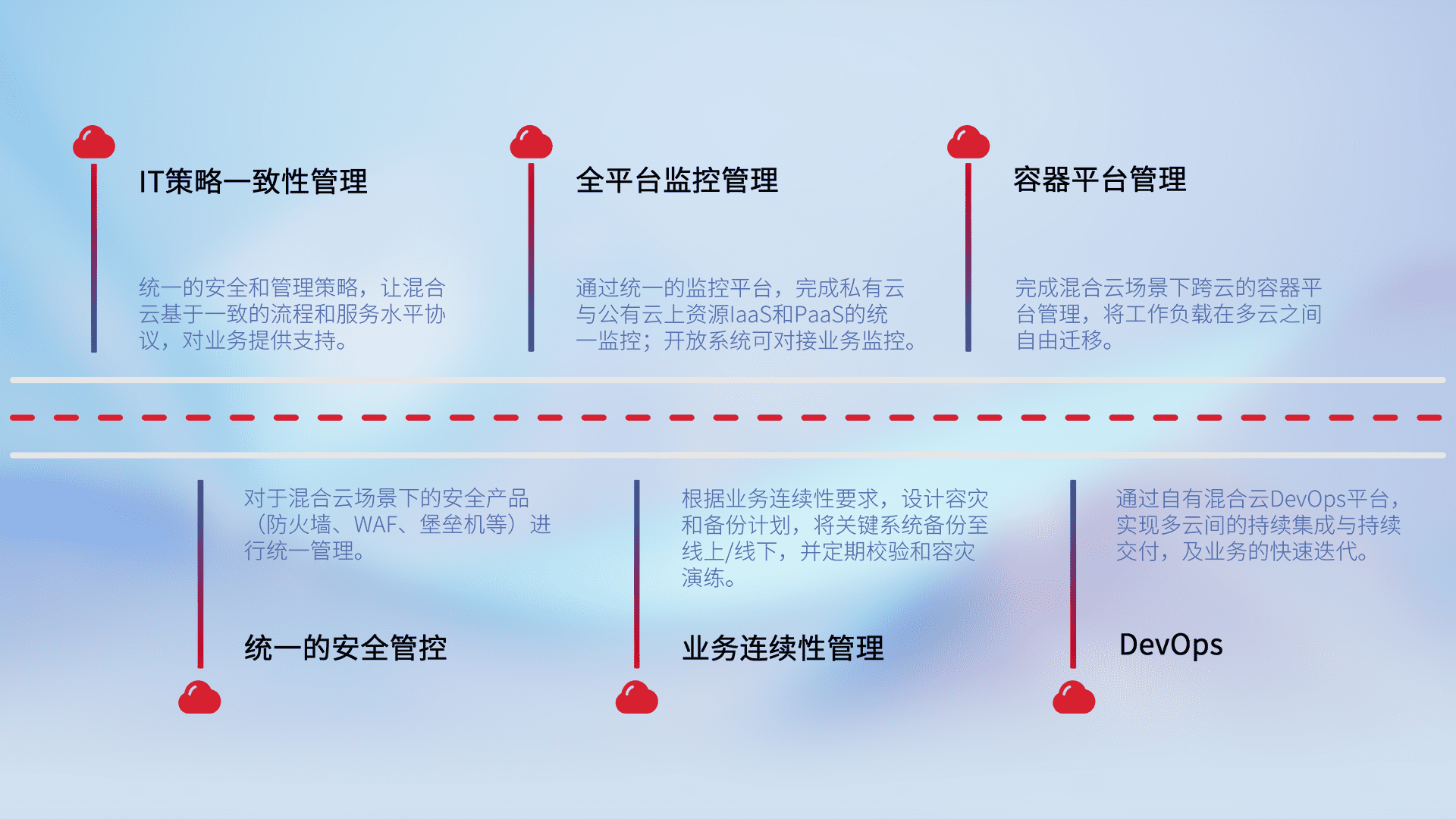 通过多云纳管,,,以统一的资源数据模型把客户的云资源进行抽象和封装,,,,进而实现对多云资源的统一操作,,保障云资源管理的可靠性、、、、稳定性与可用性。。。量身定制化运维内容,,,配置、、、开发运维、、补丁管理、、、、备份、、监控、、认证和访问管理、、、审计和日常巡检等,,,保障在用云过程中的可靠度,,稳定度以及高可用率。。。