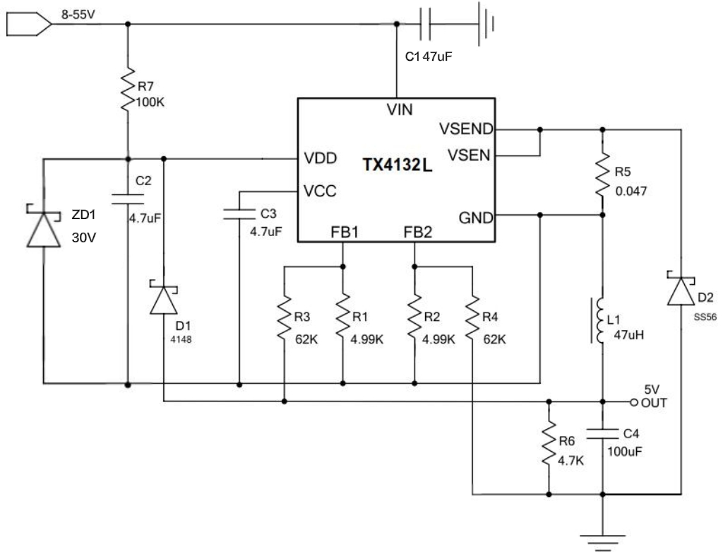 TX4132L是一款支持宽电压输入的开关降压型DC-DC芯片,,,芯片内置60V/5A功率MOS,,,支持最高输入电压55V。。。。