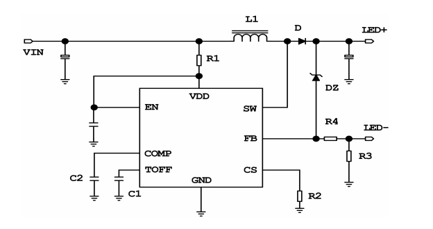 IC采用固定关断时间的控制方式,,关断时间可通过外部电容进行调节,,,工作频率可根据用户要求而改变。。